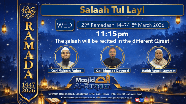 Wednesday, 18 March 2026 at 23:19Masjid Al Furqaan Live Salaah Tul Layl - 29 Ramadaan 1447/18 March 2026