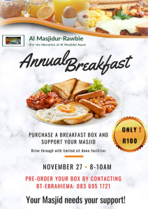 Alhumdulillah , once again Al-Masjiur Rawbie for the liberation of Al Masjidul-Aqsa will be having a much needed fundraiser for the upkeep of our beloved Masjid.