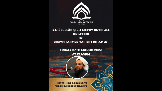 Masjidul Jumuah Milnerton Live Jumuah Lecture – A Mercy unto all Creation” by Shaykh Ahmed Tahier Mohamed